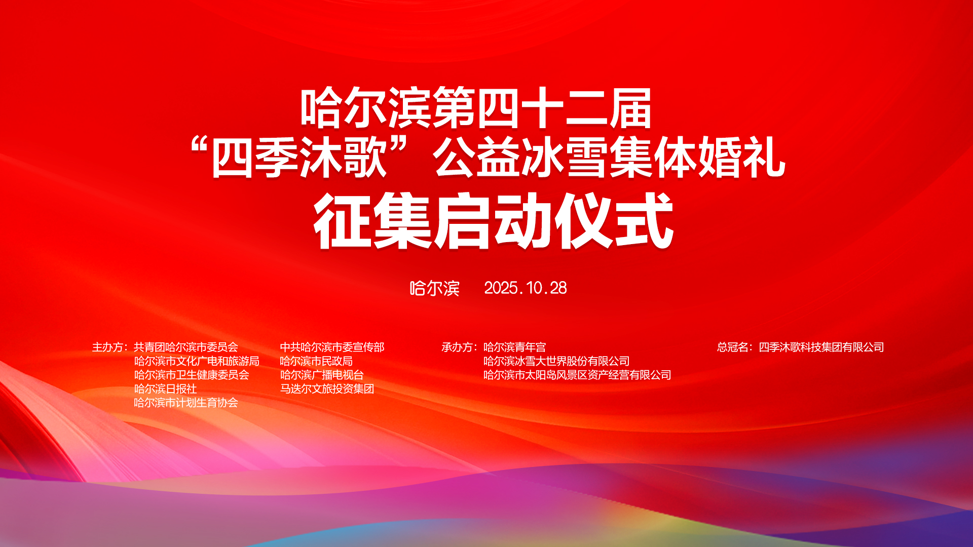 本次活动由共青团哈尔滨市委员会、中共哈尔滨市委宣传部、哈尔滨市文化广电和旅游局、哈尔滨市民政局、哈尔滨市卫生健康委员会、哈尔滨广播电视台、哈尔滨日报社、马迭尔文旅投资集团、哈尔滨市计划生育协会联合主办,哈尔滨青年宫、哈尔滨冰雪大世界、哈尔滨市太阳岛风景区承办,四季沐歌集团独家总冠名。